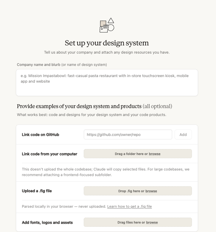 Every piece of visual material connected to your brand needs to go in, because Claude needs the full picture before it builds a design system. A logo and a color palette isn't enough. The more you feed it, the closer it gets.