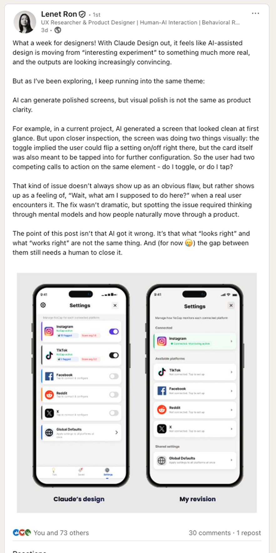 Lenet posted a perfect example of this on LinkedIn -> a Claude Design screen that looks polished. Until you notice the toggle and the card are both tappable, doing different things. The kind of conflict a designer catches in two seconds because they've watched users hesitate on screens like this before. AI generated something that passed the eye test. It took a human to see the interaction problem.