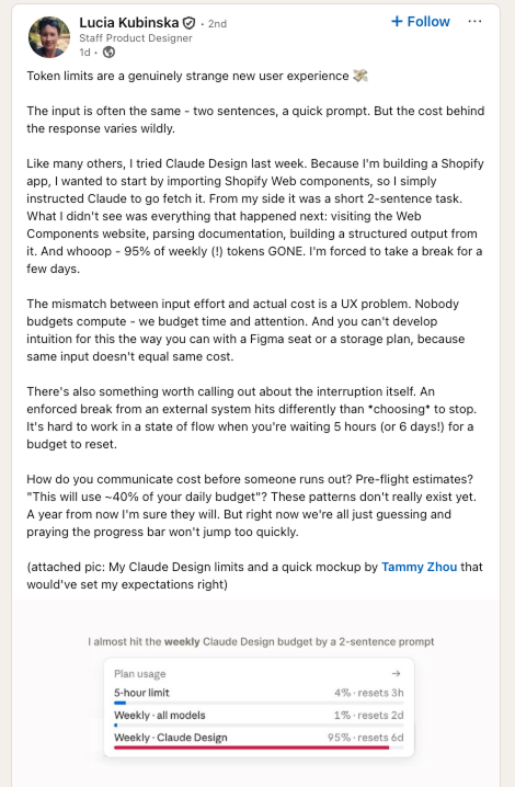 Lucia tried Claude Design for a Shopify app last week. Two sentences in, she asked Claude to import Shopify Web components. From her side, a simple prompt. Behind the scenes, Claude visited the Web Components website, parsed documentation, built structured output from it -> 95% of her weekly tokens gone. She called it a UX problem, and she's right. You can't budget time and attention around a tool when the same input doesn't equal the same cost.